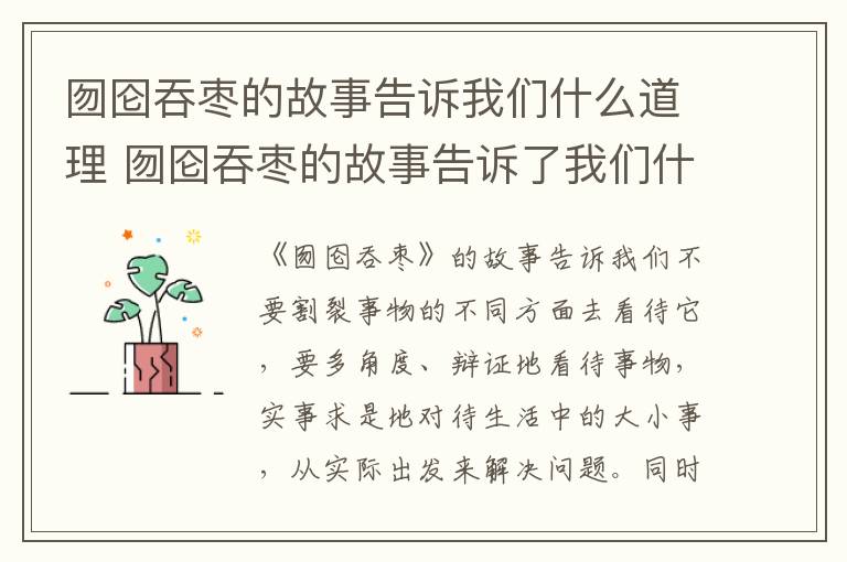 《囫囵吞枣》的故事告诉我们不要割裂事物的不同方面去看待它,要多角度、辩证地看待事物,实事求是地对待生活中的大小事,从实际出发来解决问题。同时这个故事也告诉我们,世上很少有事可以占尽全部好处,总是有好有坏的。