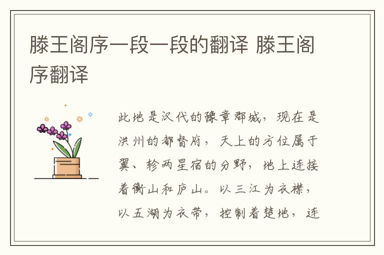 此地是汉代的豫章郡城,现在是洪州的都督府,天上的方位属于翼、轸两星宿的分野,地上连接着衡山和庐山。以三江为衣襟,以五湖为衣带,控制着楚地,连接着闽越。这里物类精华、天产珍宝,它的光彩上冲牛斗之宿。这里的土地有灵秀之气,陈蕃专为徐孺设下几榻。洪州境内的建筑如云雾排列,有才能的人士如流星一般奔驰驱走。池据于中原与南夷的交界之处,宾客与主人包括了东南地区最优秀的人物。都督阎公,享有崇高的名望,远道来到洪州坐镇,宇文州牧,是美德的楷模,赴任途中在此暂留。每逢十日一旬的假期,来了很多的良友,迎接远客,高贵的朋友坐满了席位。文词宗主孟学士所作文章就像像腾起的蛟龙、飞舞的彩凤;王将军的兵器库中,藏有像紫电、青霜这样锋利的宝剑。由于父亲在交趾做县令,我在探亲途中经过这个著名的地方。我年幼无知,竟有幸亲身参加了这次盛大的宴会。