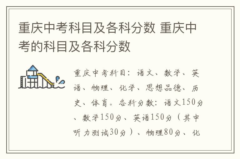 各科分数:语文150分、数学150分、英语150分(其中听力测试30分)、物理80分、化学70分、思想品德50分、历史50分、体育50分。重庆中考满分是750分,其中文化考试总分700分,体育以50分计入升学总分。