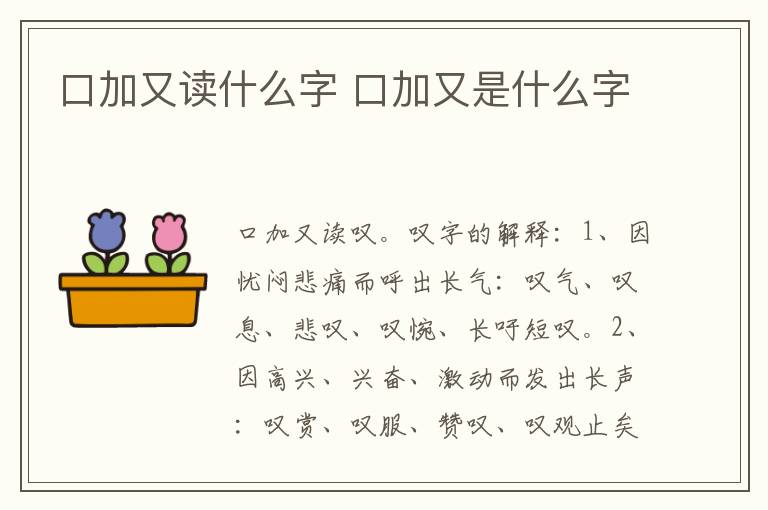 口加又读叹。叹字的解释:1、因忧闷悲痛而呼出长气:叹气、叹息、悲叹、叹惋、长吁短叹。2、因高兴、兴奋、激动而发出长声:叹赏、叹服、赞叹、叹观止矣。3、吟咏:咏叹、一唱三叹。