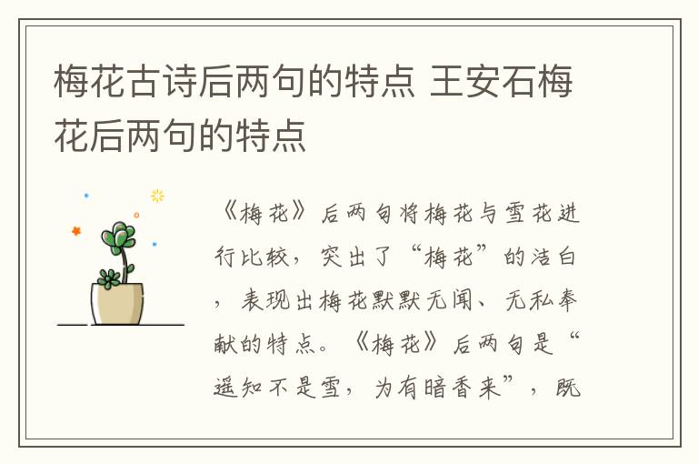 《梅花》后两句将梅花与雪花进行比较,突出了“梅花”的洁白,表现出梅花默默无闻、无私奉献的特点。《梅花》后两句是“遥知不是雪,为有暗香来”,既写梅花之洁白胜雪,也写梅花之幽香,用梅花的坚强和高洁品格抒发诗人坚持自我的信念。