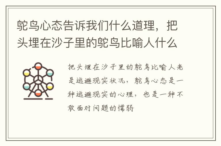 把头埋在沙子里的鸵鸟比喻人老是逃避现实状况,鸵鸟心态是一种逃避现实的心理,也是一种不敢面对问题的懦弱行为。有鸵鸟心态的人,不敢面对现实,不敢担当责任,平常大言不惭,遇到事情来临就畏缩不前了。