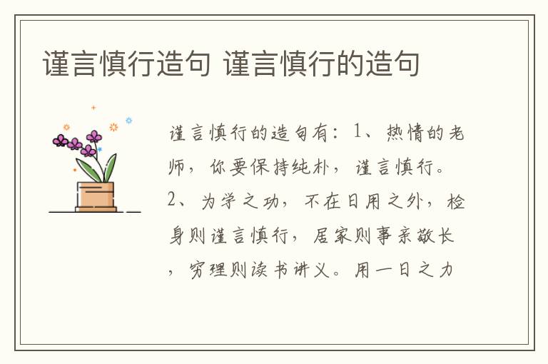 谨言慎行的造句有:1、热情的老师,你要保持纯朴,谨言慎行。2、为学之功,不在日用之外,检身则谨言慎行,居家则事亲敬长,穷理则读书讲义。用一日之力,便有一日之效。3、这不像是他说的话,他一向是一个谨言慎行的人。4、他倒是个谨言慎行,决不轻举妄动的人。