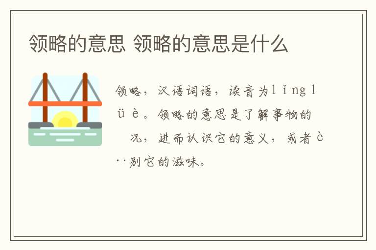 领略的意思 领略的意思是什么 知识分享 23年2月10日 编辑 童画 取消关注 关注 私信 领略,汉语词语,读音为lǐng lüè。领略的意思是了解事物的情况,进而认识它的意义,或者辨别它的滋味。词语出自南朝梁江淹、《杂体诗·效张绰》:“领略归一致,南山有绮皓、。” 领略的近义词有:明白、意会、了解、懂得、体会 词语造句:没有钓过鱼的人,恐怕是难以领略到的。 只有感受过风雨,才能领略风雨的恢弘与气势。 No related posts. 本文内容由互联网用户自发贡献,该文观点仅代表作者本人。本站仅提供信息存储空间服务,不拥有所有权,不承担相关法律责任。如发现本站有涉嫌抄袭侵权/违法违规的内容, 请发送邮件至 2245678901@qq.com 举报,一经查实,本站将立刻删除。 给TA打赏 共{{data.count}}人 人已打赏