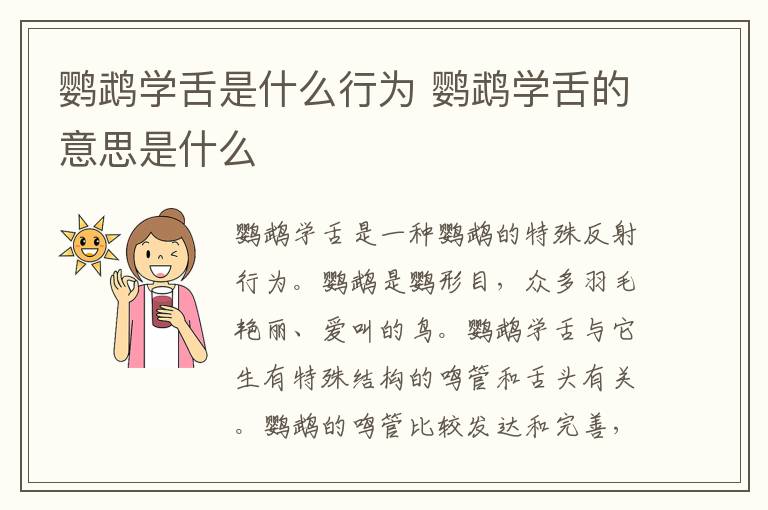 鹦鹉学舌是一种鹦鹉的特殊反射行为。鹦鹉是鹦形目,众多羽毛艳丽、爱叫的鸟。鹦鹉学舌这与它生有特殊结构的鸣管和舌头有关。鹦鹉的鸣管比较发达和完善,有四至五对鸣肌,在神经系统控制下,使鸣管中的半月膜收缩或松弛,回旋振动发出鸣声。