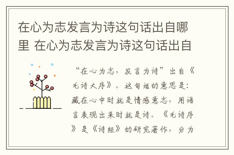“在心为志,发言为诗。”出自《毛诗大序》。这句话的意思是:藏在心中时就是情感意志,用语言表现出来时就是诗。《毛诗序》是《诗经》的研究著作,分为大序和小序,对诗歌的性质、内容、分类、审美特征等方面都作了比较系统而明晰的阐述。