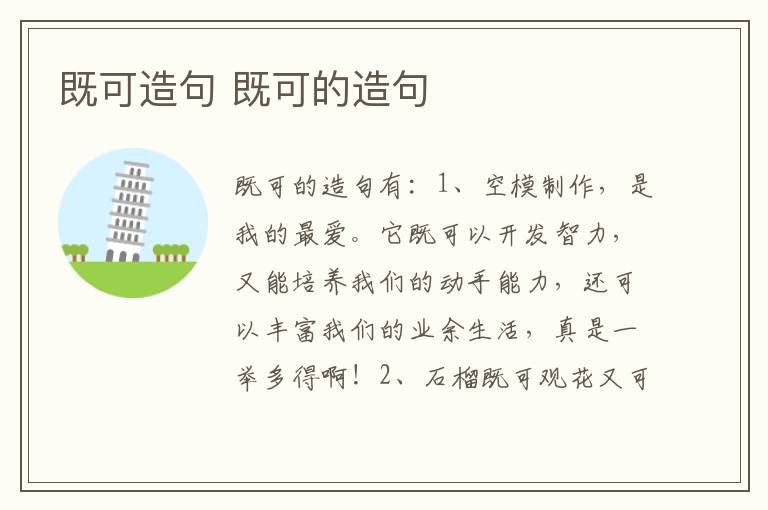 既可的造句有:1、空模制作,是我的最爱。它既可以开发智力,又能培养我们的动手能力,还可以丰富我们的业余生活,真是一举多得啊!2、石榴既可观花又可观果,且可食用。小型盆栽的花石榴可用来摆设盆花群或供室内观赏,大型的果石榴可栽在大盆内,在花卉装饰中作立体陈设或作背景材科。3、我家有一只既可爱又淘气的小白狗,我们都叫它点点。