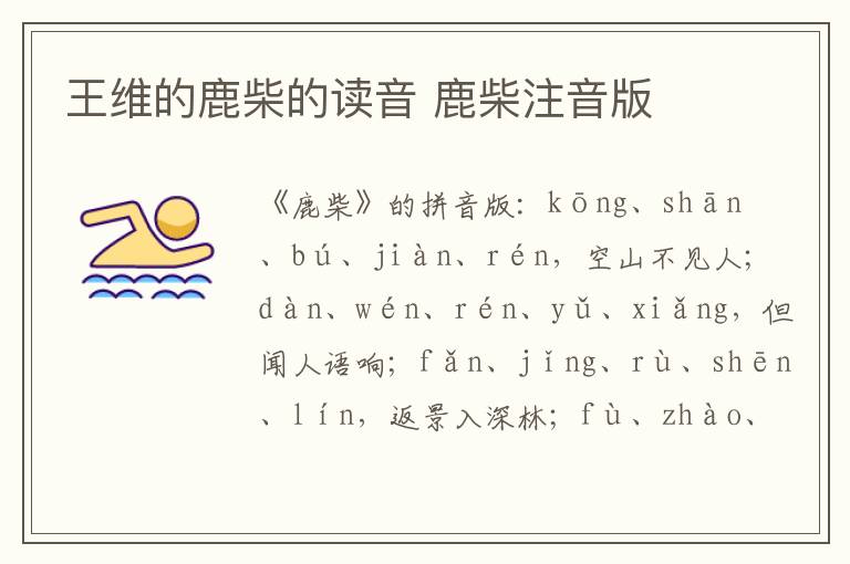 《鹿柴》的拼音版:kōng shān bú jiàn rén,空山不见人;dàn wén rén yǔ xiǎng,但闻人语响;fǎn jǐng rù
