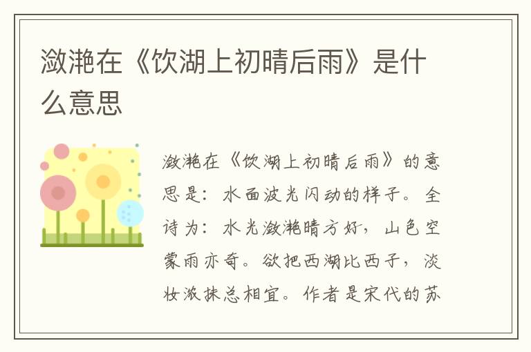 潋滟在《饮湖上初晴后雨》的意思是:水面波光闪动的样子。这首诗的作者是宋代的苏轼。
