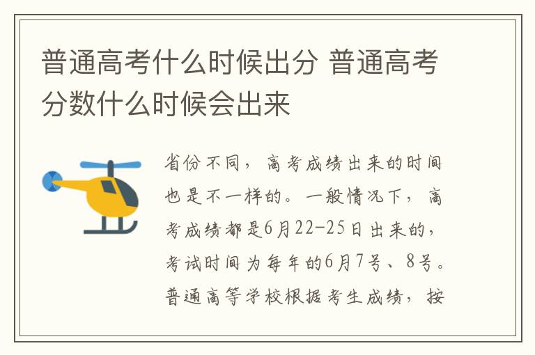 省份不同,高考成绩出来的时间也是不一样的。一般情况下,高考成绩都是6月22-25日出来的,考试时间为每年的6月7号、8号。普通高等学校根据考生成绩,按照招生章程和计划,德智体美劳全面衡量,择优录取。