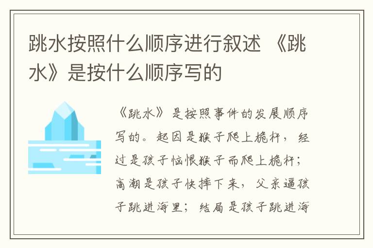 《跳水》是按照事件的发展顺序写的。起因是猴子爬上桅杆,经过是孩子恼恨猴子而爬上桅杆;高潮是孩子快摔下来,父亲逼孩子跳进海里;结局是孩子跳进海里,人们将他救起。