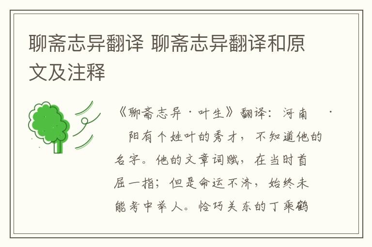 《聊斋志异·叶生》翻译:河南淮阳有个姓叶的秀才,不知道他的名字。他的文章词赋,在当时首屈一指;但是命运不济,始终未能考中举人。恰巧关东的丁乘鹤,来担任淮阳县令。他见到叶生的文章,认为不同寻常,便召叶生来谈话,结果非常高兴。到了开科考试的时候,丁公在学使面前称赞叶生,使他得了科试第一名。丁公对叶生的前途寄予极大的希望。乡试考完,丁公要叶生的文稿来阅读,拍案叫好。