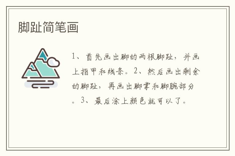 脚趾简笔画 知识分享 23年2月11日 编辑 童画 取消关注 关注 私信 1、首先画出脚的两根脚趾,并画上指甲和线条。 2、然后画出剩余的脚趾,再画出脚掌和脚腕部分。 3、最后涂上颜色就可以了。 No related posts. 本文内容由互联网用户自发贡献,该文观点仅代表作者本人。本站仅提供信息存储空间服务,不拥有所有权,不承担相关法律责任。如发现本站有涉嫌抄袭侵权/违法违规的内容, 请发送邮件至 2245678901@qq.com 举报,一经查实,本站将立刻删除。 给TA打赏 共{{data.count}}人 人已打赏