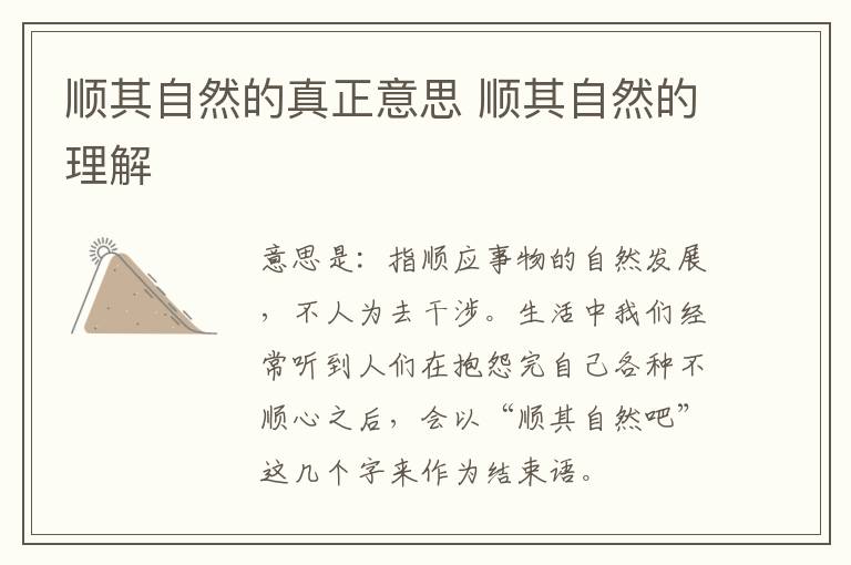 意思是:指顺应事物的自然发展,不人为去干涉。生活中我们经常听到人们在抱怨完自己各种不顺心之后,会把“顺其自然吧”这几个字来作为结束语。