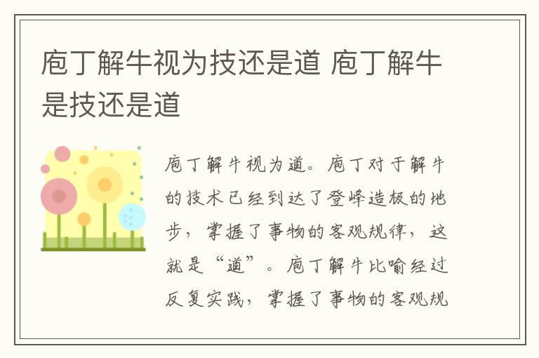 庖丁解牛视为道。庖丁对于解牛的技术已经到达了登峰造极的地步,掌握了事物的客观规律,这就是“道”。庖丁解牛比喻经过反复实践,掌握了事物的客观规律,做事得心应手,运用自如。道即变化之本,不生不灭,无形无象,无始无终,无所不包,其大无外,其小无内,过而变之、亘古不变。