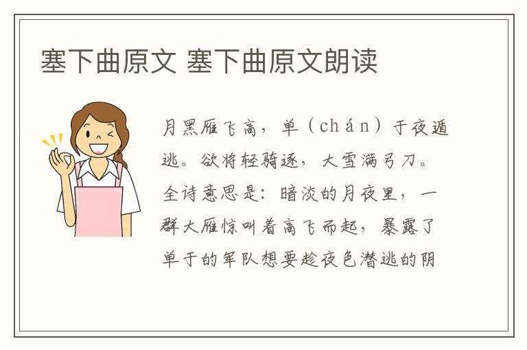 塞下曲原文 塞下曲原文朗读 知识分享 23年2月11日 编辑 童画 取消关注 关注 私信 塞下曲——卢纶 月黑雁飞高, 单(chán)于夜遁逃。 欲将轻骑逐, 大雪满弓刀。 全诗意思是:暗淡的月夜里,一群大雁惊叫着高飞而起,暴露了单于的军队想要趁夜色潜逃的阴谋。将军率领轻骑兵一路追杀,顾不得漫天的大雪已落满弓和刀。 No related posts. 本文内容由互联网用户自发贡献,该文观点仅代表作者本人。本站仅提供信息存储空间服务,不拥有所有权,不承担相关法律责任。如发现本站有涉嫌抄袭侵权/违法违规的内容, 请发送邮件至 2245678901@qq.com 举报,一经查实,本站将立刻删除。 给TA打赏 共{{data.count}}人 人已打赏