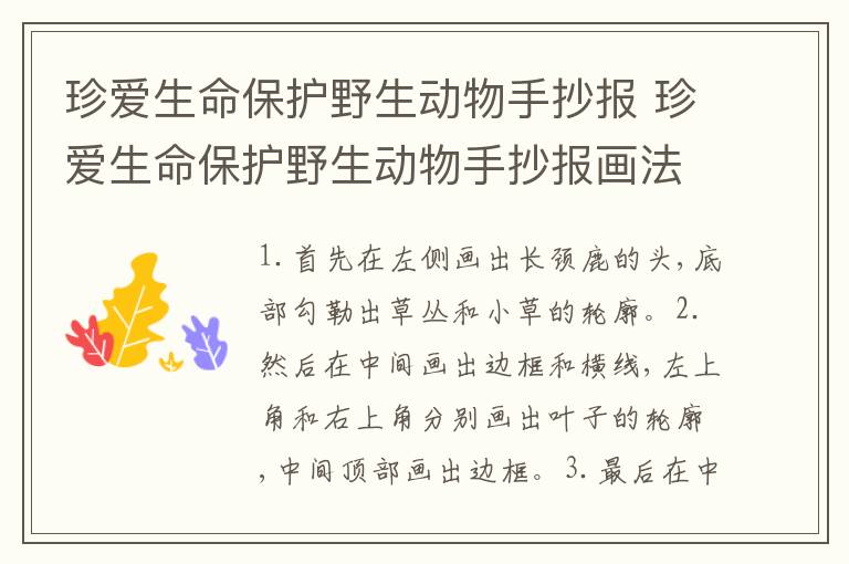 珍爱生命保护野生动物手抄报 珍爱生命保护野生动物手抄报画法 知识分享 23年2月11日 编辑 童画 取消关注 关注 私信 1.首先在左侧画出长颈鹿的头,底部勾勒出草丛和小草的轮廓。 2.然后在中间画出边框和横线,左上角和右上角分别画出叶子的轮廓,中间顶部画出边框。 3.最后在中间顶部的边框中写出【珍爱生命保护野生动物】并涂上颜色就可以了。 No related posts. 本文内容由互联网用户自发贡献,该文观点仅代表作者本人。本站仅提供信息存储空间服务,不拥有所有权,不承担相关法律责任。如发现本站有涉嫌抄袭侵权/违法违规的内容, 请发送邮件至 2245678901@qq.com 举报,一经查实,本站将立刻删除。 给TA打赏 共{{data.count}}人 人已打赏