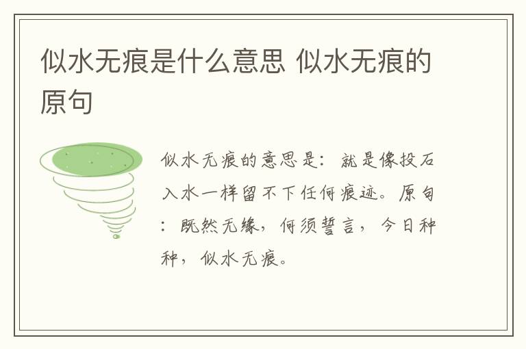 似水无痕是什么意思 似水无痕的原句 知识分享 23年2月11日 编辑 童画 取消关注 关注 私信 似水无痕的意思是:就是像投石入水一样留不下任何痕迹。原句:既然无缘,何须誓言,今日种种,似水无痕 字面意思:两个人既然没有缘分,又需要什么山盟海誓的誓言呢?就像日子已经走到今天,好像水流流过没有痕迹。 引申:暗指两个人相识却没有相知和相伴,随着时光的流过,一切都成为浮萍,没有结果。 No related posts. 本文内容由互联网用户自发贡献,该文观点仅代表作者本人。本站仅提供信息存储空间服务,不拥有所有权,不承担相关法律责任。如发现本站有涉嫌抄袭侵权/违法违规的内容, 请发送邮件至 2245678901@qq.com 举报,一经查实,本站将立刻删除。 给TA打赏 共{{data.count}}人 人已打赏