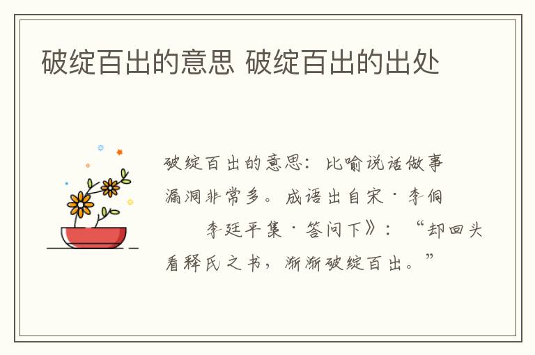 破绽百出的意思 破绽百出的出处 知识分享 23年2月11日 编辑 童画 取消关注 关注 私信 【读音】 pò zhàn bǎi chū 【释义】比喻说话做事漏洞非常多。 【出处】 宋·李侗《李廷平集·答问下》:“却回头看释氏之书,渐渐破绽百出。” 【近义词】漏洞百出 自相矛盾 【反义词】滴水不漏 无懈可击 【例句】 单从他说话破绽百出就可断定,此人一定是冒充的。 No related posts. 本文内容由互联网用户自发贡献,该文观点仅代表作者本人。本站仅提供信息存储空间服务,不拥有所有权,不承担相关法律责任。如发现本站有涉嫌抄袭侵权/违法违规的内容, 请发送邮件至 2245678901@qq.com 举报,一经查实,本站将立刻删除。 给TA打赏 共{{data.count}}人 人已打赏