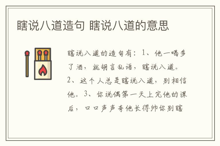 瞎说八道的造句有:1、他一喝多了酒,就胡言乱语,瞎说八道。2、这个人总是瞎说八道,别相信他。3、你说偶第一天上完他的课后,口口声声夸他长得帅你别瞎说八道了。