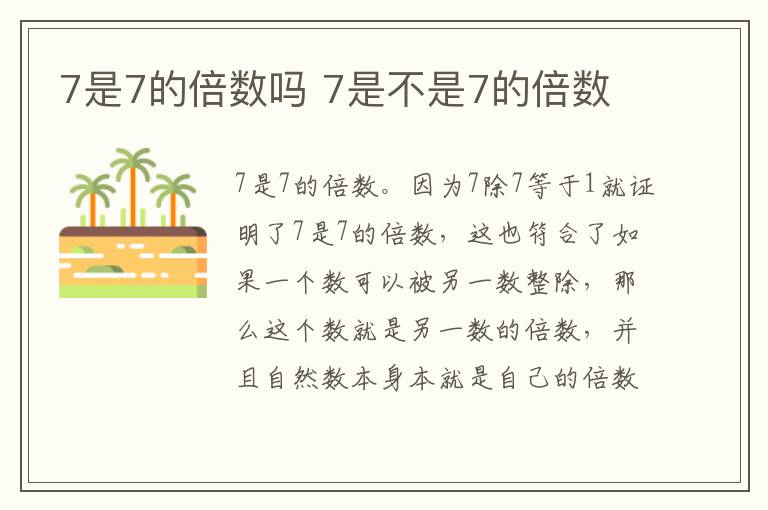 7是7的倍数吗 7是不是7的倍数 知识分享 23年2月11日 编辑 童画 取消关注 关注 私信 7是7的倍数。 因为7除7等于1就证明了7是7的倍数,这也符合了如果一个数可以被另一数整除,那么这个数就是另一数的倍数,并且自然数本身本就是自己的倍数,并且我们可以发现无论是7还是2或3,都没有比自己本身都小的倍数了。 所以我们最终可以得出结论:每个自然数最小的倍数便是它自己。 No related posts. 本文内容由互联网用户自发贡献,该文观点仅代表作者本人。本站仅提供信息存储空间服务,不拥有所有权,不承担相关法律责任。如发现本站有涉嫌抄袭侵权/违法违规的内容, 请发送邮件至 2245678901@qq.com 举报,一经查实,本站将立刻删除。 给TA打赏 共{{data.count}}人 人已打赏
