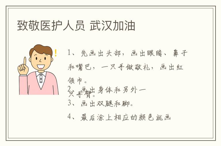 致敬医护人员 武汉加油 知识分享 23年2月11日 编辑 童画 取消关注 关注 私信 1、先画出头部,画出眼睛、鼻子和嘴巴,一只手做敬礼,画出红领巾。 2、画出身体和另外一只手臂。 3、画出双腿和脚。 4、最后涂上相应的颜色就画好了。 No related posts. 本文内容由互联网用户自发贡献,该文观点仅代表作者本人。本站仅提供信息存储空间服务,不拥有所有权,不承担相关法律责任。如发现本站有涉嫌抄袭侵权/违法违规的内容, 请发送邮件至 2245678901@qq.com 举报,一经查实,本站将立刻删除。 给TA打赏 共{{data.count}}人 人已打赏