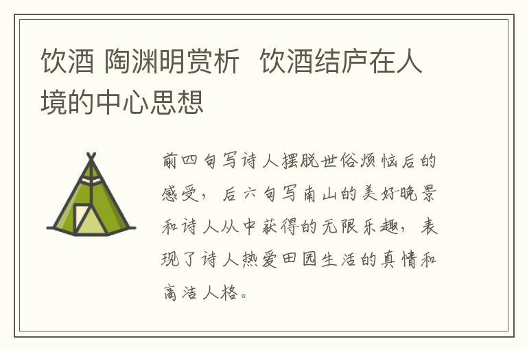 《饮酒·结庐在人境》是晋朝大诗人陶渊明创作的组诗《饮酒二十首》的第五首诗。这首诗主要表现隐居生活的情趣,写诗人于劳动之余,饮酒至醉之后,在晚霞的辉映之下,在山岚的笼罩之中,采菊东篱,遥望南山。表现了作者悠闲自得的心境和对宁静自由的田园生活的热爱,对黑暗官场的鄙弃和厌恶,抒发作者宁静安详的心态和闲适自得的情趣,以及返回自然的人生理想,又写出了作者欣赏以及赞叹大自然给人带来的情感。