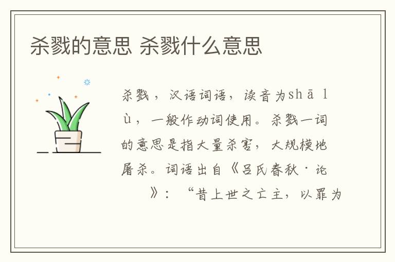 杀戮,汉语词语,读音为shā lù,一般作动词使用。杀戮一词的意思是指大量杀害,大规模地屠杀。词语出自《吕氏春秋·论人》:“昔上世之亡主,以罪为在人,故日杀僇而不止,以至於亡而不悟。”