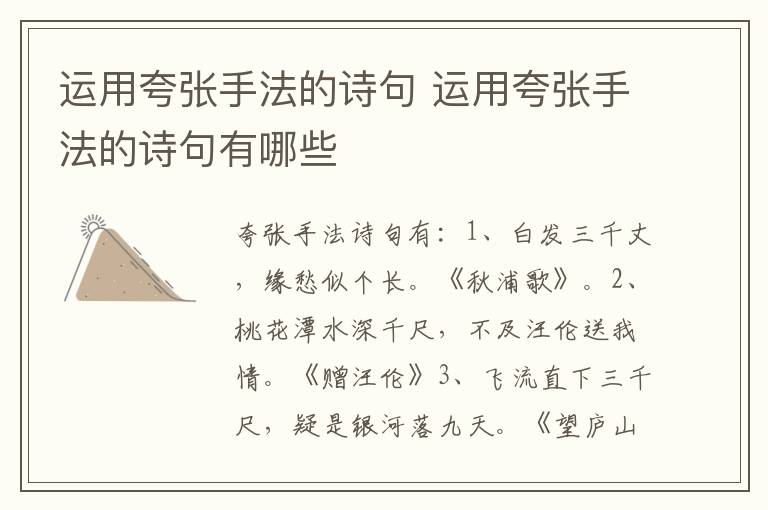 夸张手法诗句有:1、白发三千丈,缘愁似个长。《秋浦歌》。2、桃花潭水深千尺,不及汪伦送我情。《赠汪伦》3、飞流直下三千尺,疑是银河落九天。《望庐山瀑布》