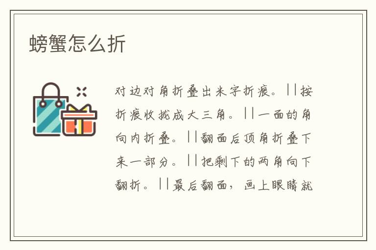 螃蟹怎么折 知识分享 23年2月11日 编辑 童画 取消关注 关注 私信 1.对边对角折叠出米字折痕; 2.按折痕收拢成大三角; 3.一面的角向内折叠; 4.翻面后顶角折叠下来一部分; 5.把剩下的两角向下翻折; 6.最后翻面,画上眼睛就折好了。 No related posts. 本文内容由互联网用户自发贡献,该文观点仅代表作者本人。本站仅提供信息存储空间服务,不拥有所有权,不承担相关法律责任。如发现本站有涉嫌抄袭侵权/违法违规的内容, 请发送邮件至 2245678901@qq.com 举报,一经查实,本站将立刻删除。 给TA打赏 共{{data.count}}人 人已打赏