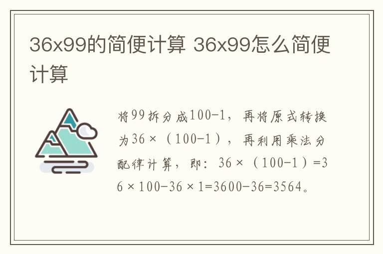 将99拆分成100-1,再将原式转换为36×(100-1),再利用乘法分配律计算,即:36×(100-1)=36×100-36×1=3600-36=3564。