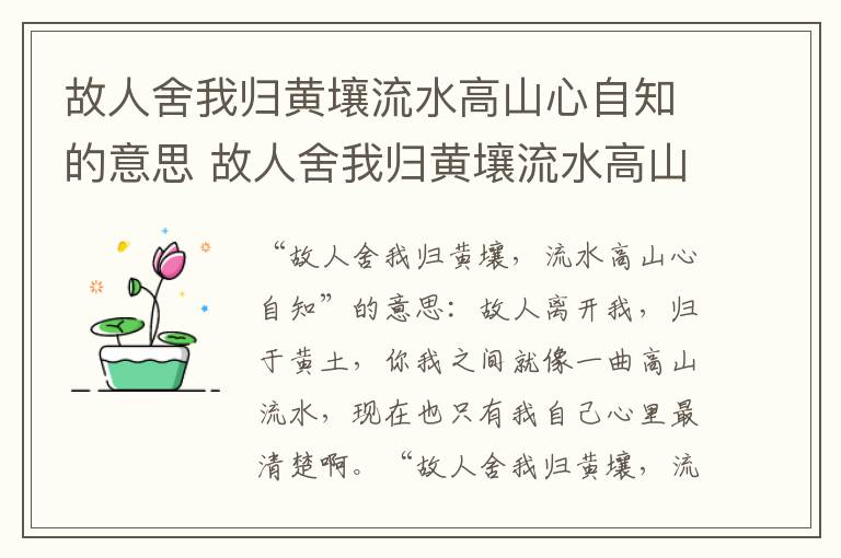 “故人舍我归黄壤,流水高山心自知”的意思:故人离开我,归于黄土,你我之间就像一曲高山流水,现在也只有我自己心里最清楚啊。“故人舍我归黄壤,流水高山心自知”出自宋代文学家王安石的诗作《伯牙》。