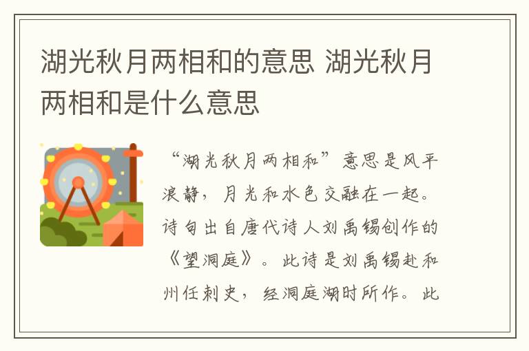 “湖光秋月两相和”意思是风平浪静,月光和水色交融在一起。诗句出自唐代诗人刘禹锡创作的《望洞庭》,全诗内容为: