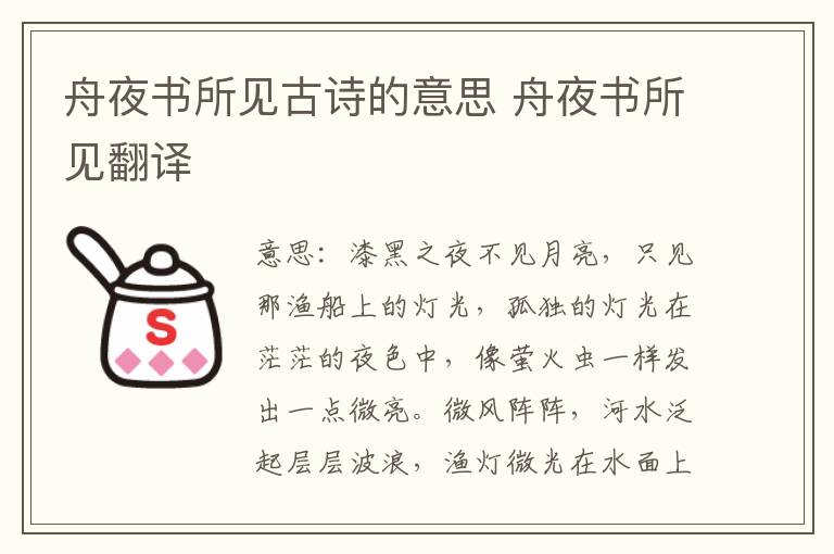 意思:漆黑之夜不见月亮,只见那渔船上的灯光,孤独的灯光在茫茫的夜色中,像萤火虫一样发出一点微亮。微风阵阵,河水泛起层层波浪,渔灯微光在水面上散开,河面好像撒落无数的星星。《舟夜书所见》是清代诗人查慎行创作的一首五言绝句。