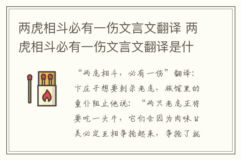 “两虎相斗,必有一伤”翻译:卞庄子想要刺杀老虎,旅馆里的童仆阻止他说:“两只老虎正将要吃一头牛,它们会因为肉味甘美必定互相争抢起来,争抢了就必定会打起来,打完强者受伤,弱者死亡。(再)刺杀伤虎,一次行动就有杀死两只老虎的名声。”
