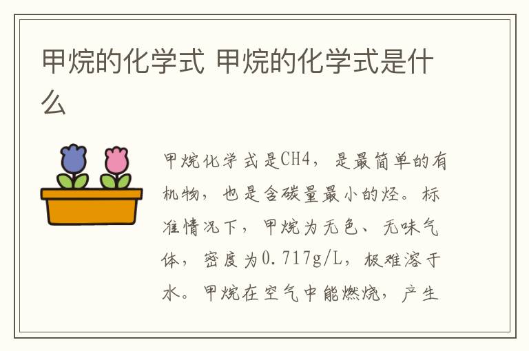 甲烷是一种有机化合物,化学式是CH4,是最简单的有机物,也是含碳量最小的烃。标准情况下,甲烷为无色、无味气体,密度为0.717g/L,极难溶于水。甲烷在空气中能燃烧,产生二氧化碳和水。点燃纯净的甲烷,在火焰的上方罩一个干燥的烧杯,很快就可以看到有水蒸气在烧杯壁上凝结。