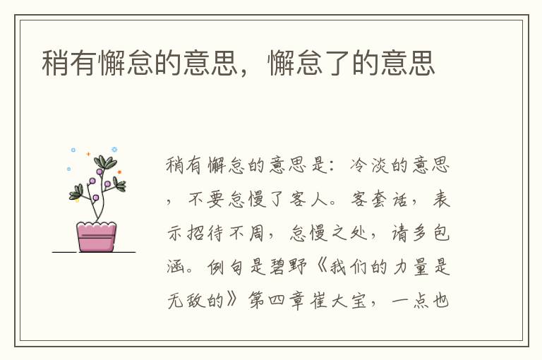 稍有懈怠的意思是:冷淡的意思,不要怠慢了客人。客套话,表示招待不周,怠慢之处,请多包涵。碧野 《我们的力量是无敌的》第四章崔大宝 一点也不敢怠慢,他很快地捡来了两箱机枪弹。