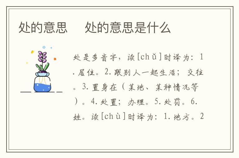 处是多音字,读[chǔ]时译为:1.居住。2.跟别人一起生活;交往。3.置身在(某地、某种情况等)。4.处置;办理。5.处罚。6.姓。读[chù]时译为:1.地方。2.机关组织系统中按业务划分的单位(级别一般比局低,比科高),也指某些机关。