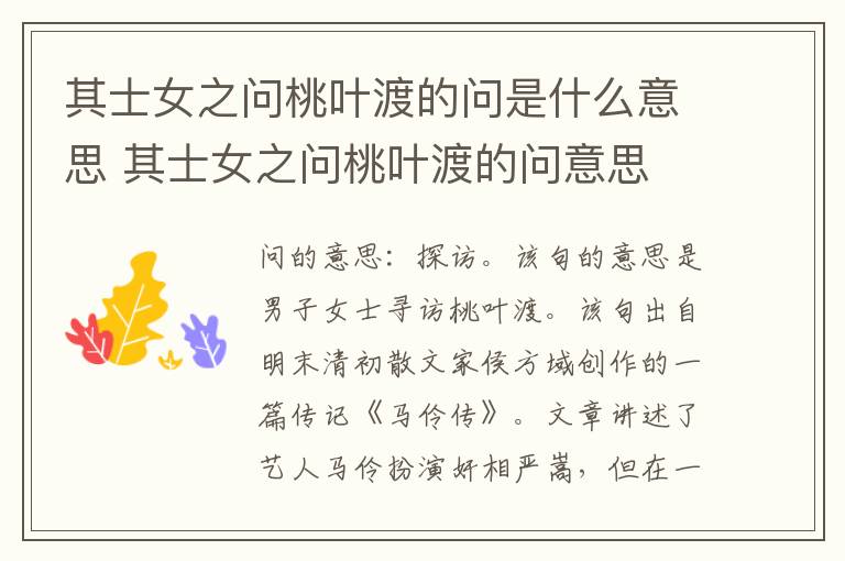 问的意思:探访。该句的意思是男子女士寻访桃叶渡。该句出自明末清初散文家侯方域创作的一篇传记《马伶传》。文章讲述了艺人马伶扮演奸相严嵩,但在一次技艺较量中输给了李伶。他远去京师隐姓埋名作了当朝相国顾秉谦的门卒,于观察模仿中提高技艺,三年后在第二次技艺较量中终获成功。