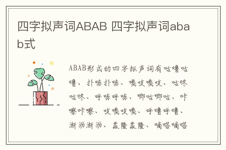 ABAB形式的四字拟声词有咕噜咕噜、扑哧扑哧、嘎吱嘎吱、咕咚咕咚、呼哧呼哧、唧咕唧咕、咔嚓咔嚓、吱嘎吱嘎、呼噜呼噜、淅沥淅沥、轰隆轰隆、嘀嗒嘀嗒、咯吱咯吱。拟声词指的是模拟自然界声响而造的词汇。