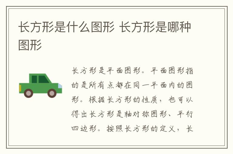 长方形属于平面图形,平面图形指的是所有点都在同一平面内的图形。根据长方形的性质,也可以得出长方形是轴对称图形、平行四边形。按照长方形的定义,长方形是有一个角是直角的平行四边形。