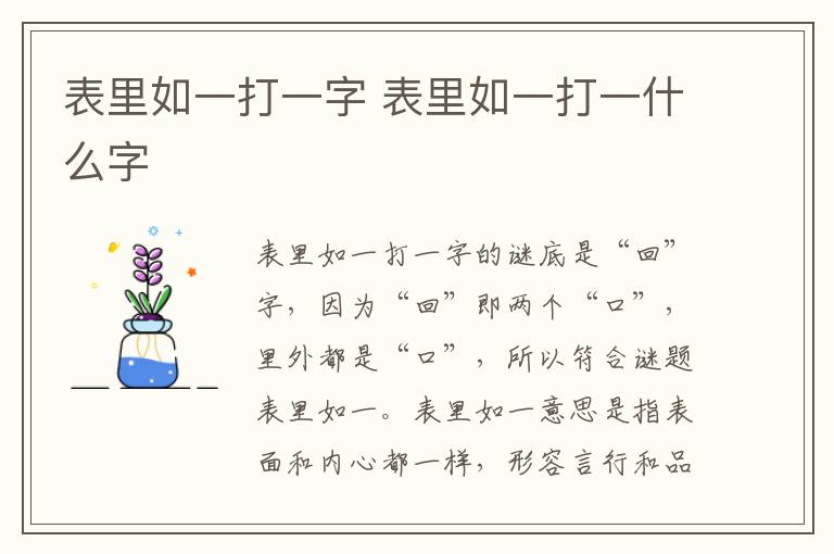 表里如一打一字的谜底是“回”字,因为“回”即两个“口”,里外都是“口”,所以符合谜题表里如一。