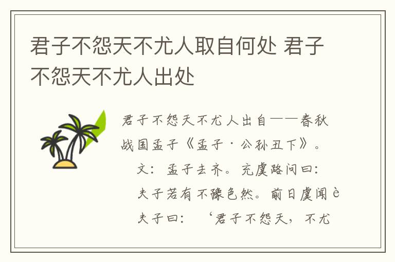 君子不怨天不尤人取自何处 君子不怨天不尤人出处 知识分享 23年2月11日 编辑 童画 取消关注 关注 私信 出自——春秋战国孟子《孟子·公孙丑下》。原文:孟子去齐。充虞路问曰:“夫子若有不豫色然。前日虞闻诸夫子曰: ‘君子不怨天,不尤人。’” 【译文】孔子说:“没有人了解我啊!”子贡说:“怎么能说没有人了解您呢?”孔子说:“我不埋怨天,也不责备人,下学礼乐而上达天命,了解我的只有天吧!” No related posts. 本文内容由互联网用户自发贡献,该文观点仅代表作者本人。本站仅提供信息存储空间服务,不拥有所有权,不承担相关法律责任。如发现本站有涉嫌抄袭侵权/违法违规的内容, 请发送邮件至 2245678901@qq.com 举报,一经查实,本站将立刻删除。 给TA打赏 共{{data.count}}人 人已打赏