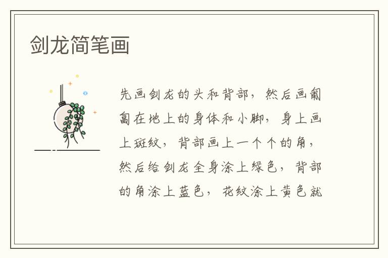 剑龙简笔画 知识分享 23年2月11日 编辑 童画 取消关注 关注 私信 1、先画剑龙的头和背部, 2、然后画匍匐在地上的身体和小脚,身上画上斑纹,背部画上一个个的角, 3、然后给剑龙全身涂上绿色,背部的角涂上蓝色,花纹涂上黄色就可以了。 No related posts. 本文内容由互联网用户自发贡献,该文观点仅代表作者本人。本站仅提供信息存储空间服务,不拥有所有权,不承担相关法律责任。如发现本站有涉嫌抄袭侵权/违法违规的内容, 请发送邮件至 2245678901@qq.com 举报,一经查实,本站将立刻删除。 给TA打赏 共{{data.count}}人 人已打赏