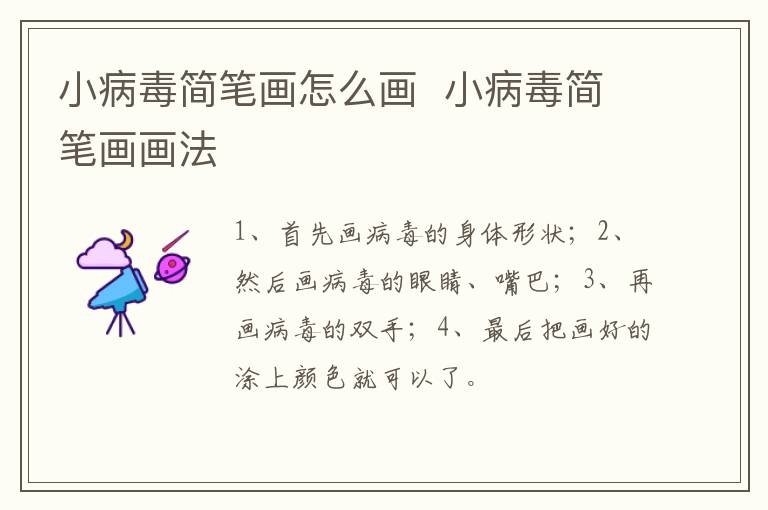 小病毒简笔画怎么画 小病毒简笔画画法简单又漂亮 知识分享 23年2月11日 编辑 童画 取消关注 关注 私信 1、首先画病毒的身体形状; 2、然后画病毒的眼睛、嘴巴; 3、再画病毒的双手; 4、最后把画好的涂上颜色就可以了。 No related posts. 本文内容由互联网用户自发贡献,该文观点仅代表作者本人。本站仅提供信息存储空间服务,不拥有所有权,不承担相关法律责任。如发现本站有涉嫌抄袭侵权/违法违规的内容, 请发送邮件至 2245678901@qq.com 举报,一经查实,本站将立刻删除。 给TA打赏 共{{data.count}}人 人已打赏