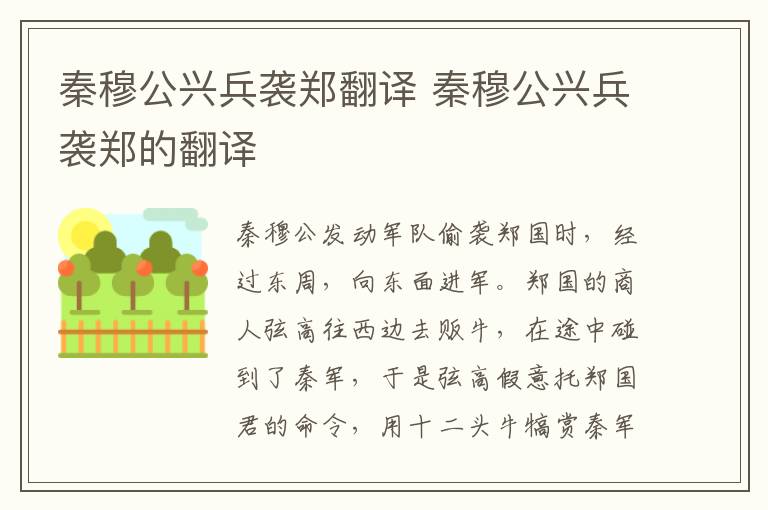 “秦穆公兴兵袭郑”的翻译:秦穆公发动军队偷袭郑国时,经过东周,向东面进军。郑国的商人弦高往西边去贩牛,在途中碰到了秦军,于是弦高假意托郑国君的命令,用十二头牛犒赏秦军、礼待秦军,使秦军以为郑国已知道这次偷袭计划而不敢贸然前进,只得撤退,从而保存了郑国,使之不至于沦为秦国的“殖民地”。