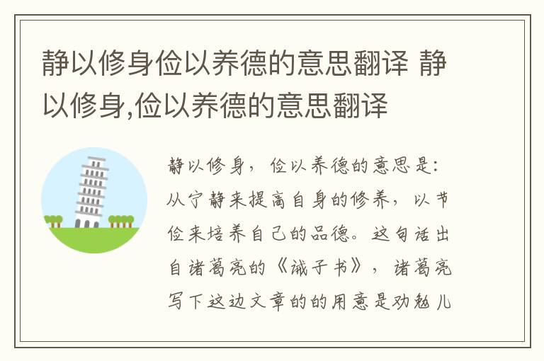 静以修身,俭以养德的意思是从宁静来提高自身的修养,以节俭来培养自己的品德。这句话出自诸葛亮的《诫子书》,诸葛亮写下这边文章的的用意是劝勉儿子勤学、立志、修身养性,要从淡泊宁静中下功夫,最忌淫慢和险躁,让他的儿子懂得恬淡寡欲,要明确自己的志向,不能平和安静就不能实现自己远大的目标。