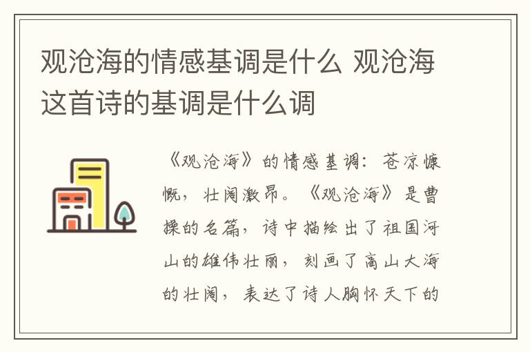 《观沧海》的情感基调:苍凉慷慨,壮阔激昂。《观沧海》是曹操的名篇,诗中描绘出了祖国河山的雄伟壮丽,刻画了高山大海的壮阔,表达了诗人胸怀天下的进取精神。