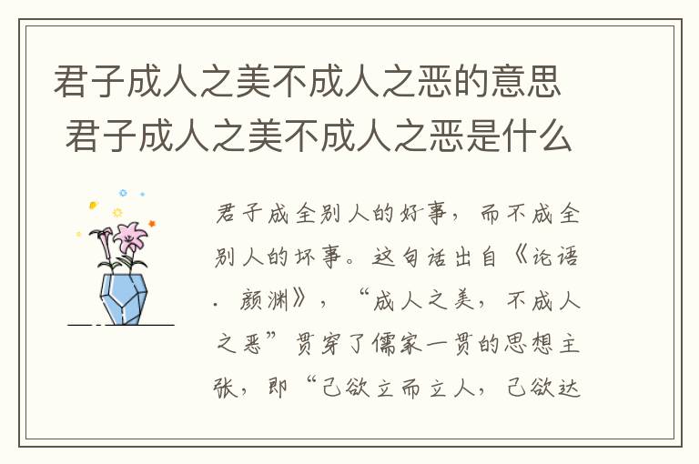 “君子成人之美,不成人之恶”的意思是:君子成全别人的好事,而不成全别人的坏事。这句话出自《论语.颜渊》,讲的“成人之美,不成人之恶”贯穿了儒家一贯的思想主张,即“己欲立而立人,己欲达而达人”、“己所不欲,勿施于人”的精神。