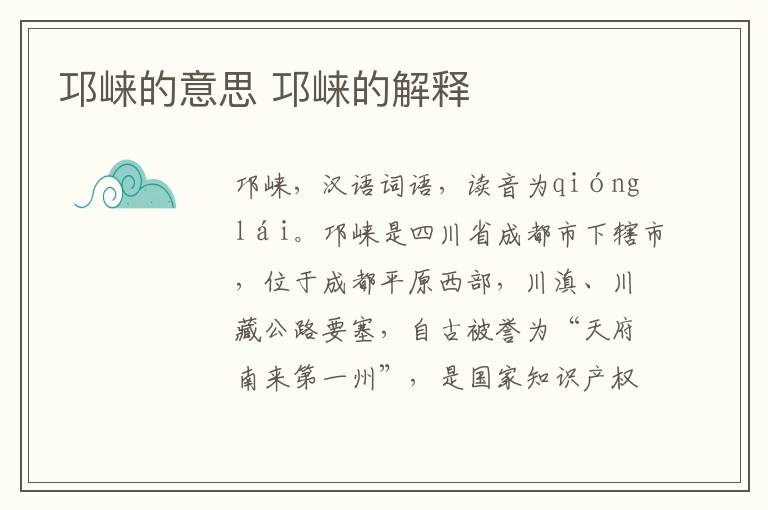 邛崃,汉语词语,读音为qióng lái。邛崃是四川省成都市下辖市,位于成都平原西部,川滇、川藏公路要塞,自古被誉为“天府南来第一州”,是国家知识产权强县工程试点县。